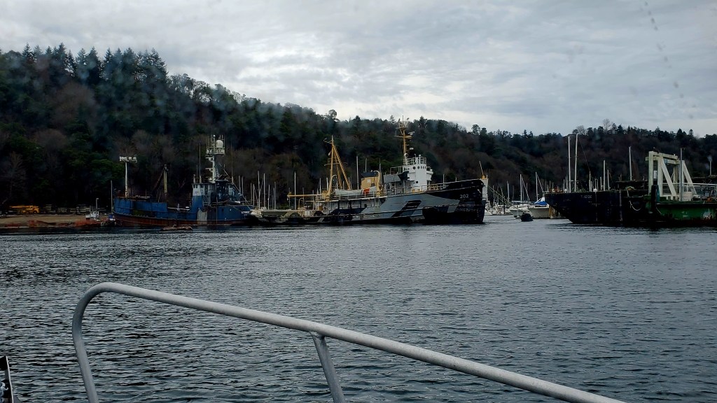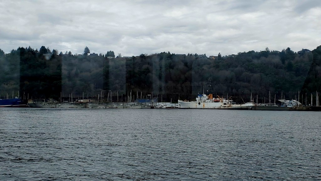 The old USCG cutter Comanche is part of the mess along the shoreline, along with a cement hull of some big old boat, and part of the old 520 bridge!