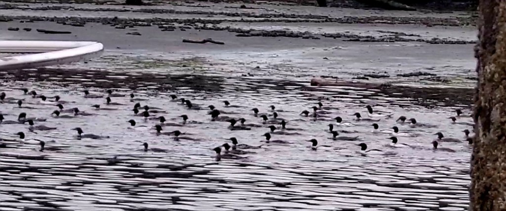 We were entertained for just a few minutes when about 200 common mergansers decided to fish in unison in the shallows near shore. It was quite spectacular to watch, and even better when they got spooked and took off in one tightly packed group.