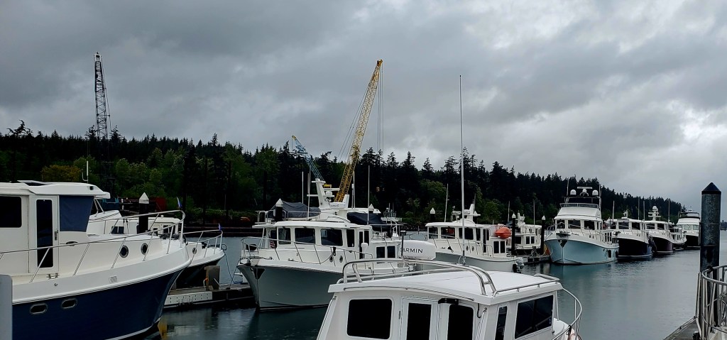More importantly, it’s the factory Spring Fling, an annual American Tug event hosted by our boat builder. They took a few years off so this our first event of this kind. We moved from the AT dock to the La Conner Marina yesterday. Unfortunately the forecast is not good. On a positive note, we will have the nearby Swinomish Yacht Club clubhouse to use…a nice option for getting out of the weather while getting (re)acquainted with other owners. Not sure how many boats are expected but they started rolling in yesterday and many more are expected today for the event kickoff.