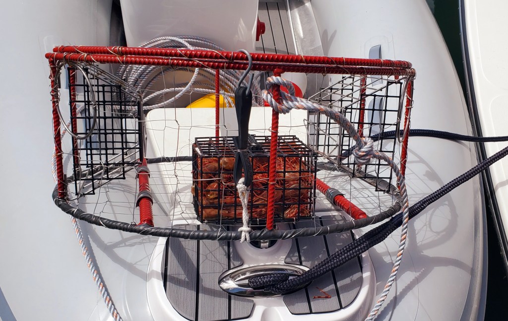 After an overnight soak, with prawn heads supplied (for free!) by the marina folks, we finally got three keepers. Yet another awesome thing? They have an outdoor cook top, and crab-cooking pots, under a covered area on the dock for all to use! Nice to keep the crab-cooking off the boat.