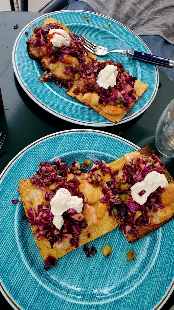 First, a fish identification correction: What we thought might be a small halibut was really a rock sole. We borrowed some flour (thanks Deb!), Nick fried it up with our handful of prawns, and made fish & prawn tostadas! Yum!