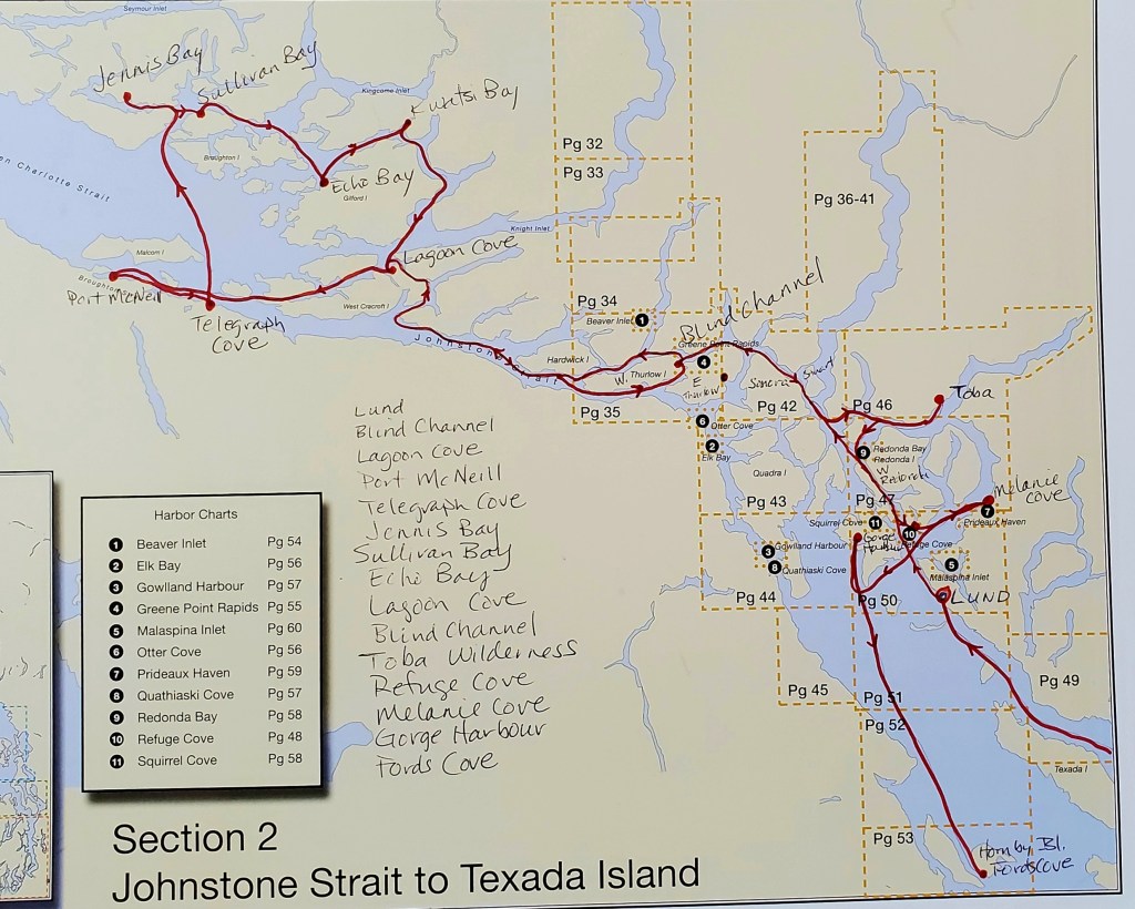 What a trip! Here is our route in the Desolation Sound (right side of map) and Broughton Archipelago (heart-shaped) areas (see summary at the end of this post):