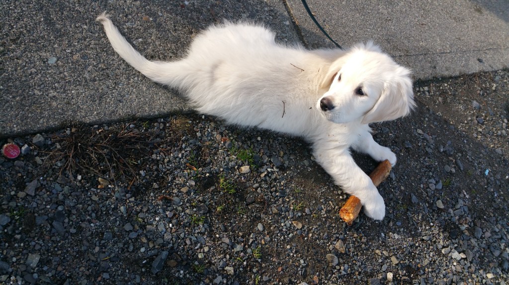 Our good friends aboard Coorie Doon recently said goodbye to their dog, Gus. I’ve written about Gus many times, as a companion on many a boating adventure. He came upon the scene not long after we met Jeanie and Steve. Here is an early photo of Gus as a puppy on the Tacoma waterfront while Steve was diving.