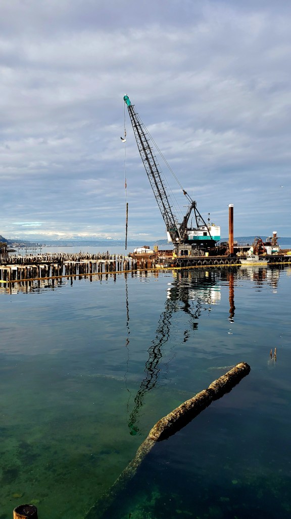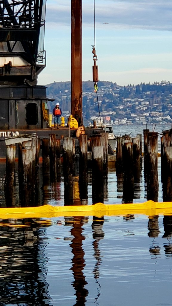 On Thursday we took a second walk down Ruston Way to watch the removal of the pilings at the old Dickman Mill site. Quite the project. It’s one of the Filthy Four and it’s good to see the work underway. There’s been a survey boat and a lot of other activity around that we think may be related. I overheard that some outfit is conducting noise detection monitoring in the area to make sure that the piling removal work is not contributing to loud “whale-unfriendly” sound.