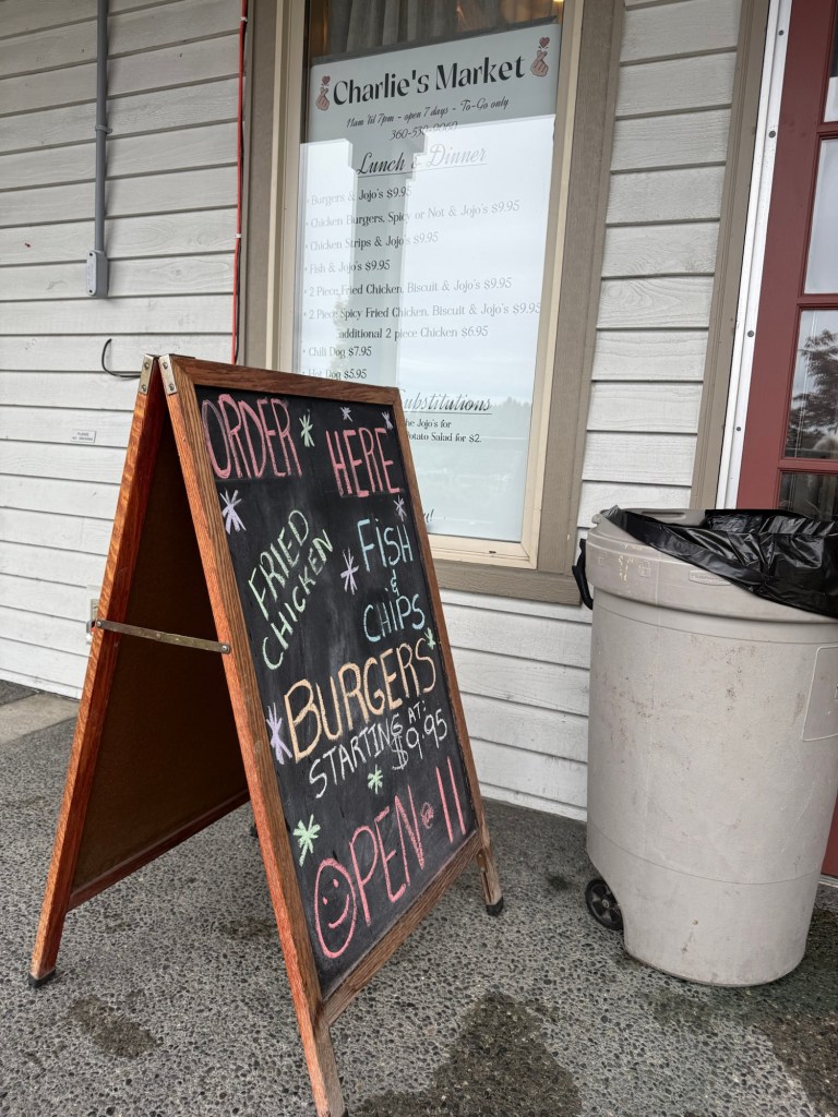 As we walked around Friday Harbor Thursday, we saw that the new store is open in the old Cask & Schooner building. Charlie’s Market is a mishmash of light groceries/convenience items and some clothing and gifts. Around the side, they have a take-out window for food. Although we wish it were still the pub, it’s nice to see something going on there instead of an empty building.