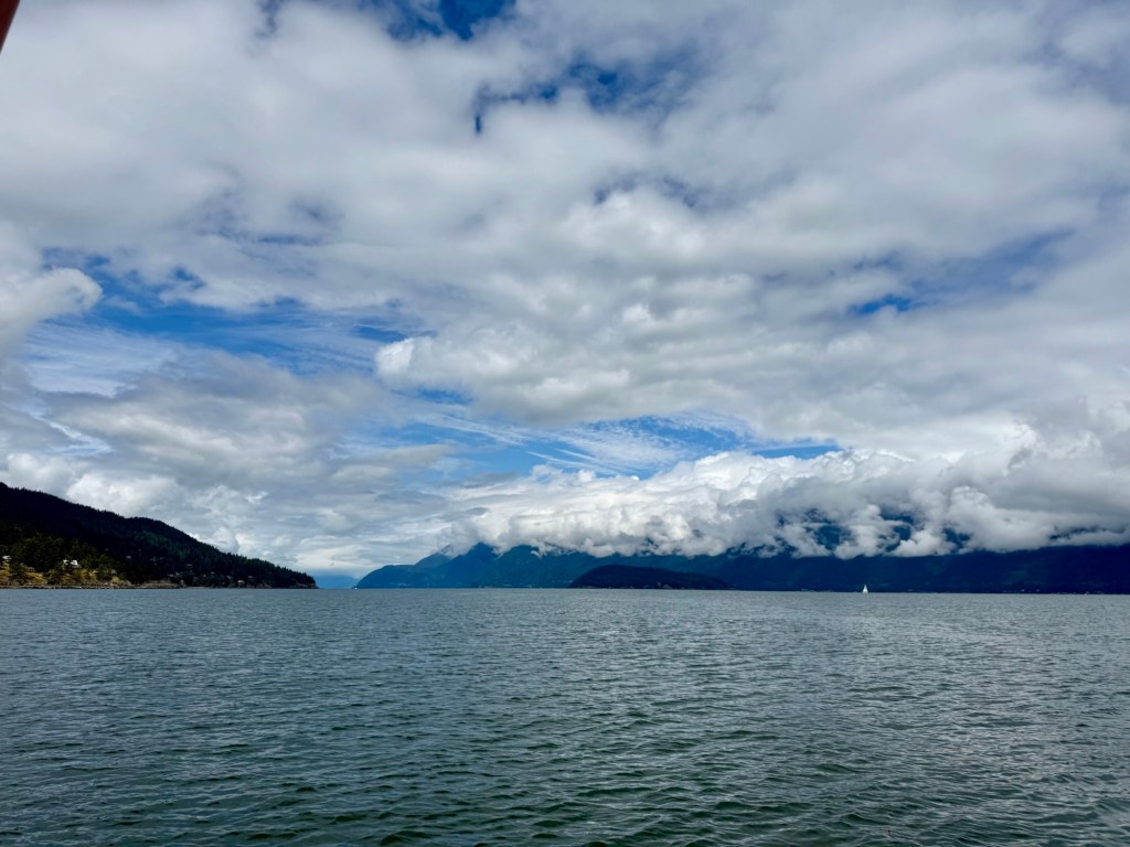 Our original plan was to check out Smuggler Cove, where we haven’t been before, but once we got out on the water the cruising conditions were optimal – smooth glassy water and blue sky – so we’ve decided to keep going. We’re now headed to kalpilin. (Pender Harbour – name changed in 2023 to reflect First Nation language, culture and heritage.) We hope to anchor in Garden Bay, rather than stay at the Madeira Park Wharf dock, which is where we’ve stayed in the past.