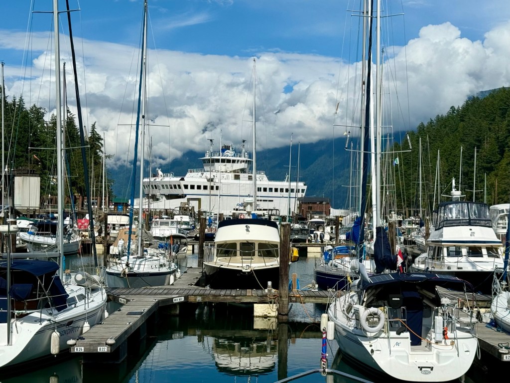 Union Steamship Marina is a lovely small place in Snug Cove on Bowen Island in Howe Sound, British Columbia. We arrived Wednesday after a 43 nm cruise from Blaine. The cove is an offshoot of the larger Mannion Bay and is quite picturesque, with the nicely kept marina, ferry landing, shops and restaurants. (And where much of Virgin River is filmed.)