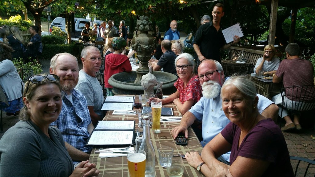 We were here once before, in 2018, with a group of Ranger Tug owners. The weather was shite, and after a rough ride we all tucked in and then got “stuck” here for a few days instead of the planned one overnight. What a place to get stuck! Here is a photo of the six of us having dinner seven years ago: