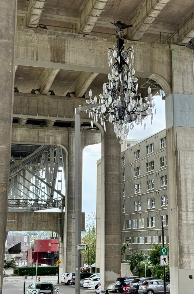 There is a chandelier hanging under the Granville Bridge, right by the yacht club and we took a quick walk to look at it Friday afternoon. (The FCYC is the red building at the bottom of the photo.) Three times a day, it drops, lights up, and spins. Well, it dropped and lit up but didn’t spin. Pretty cool thing to see hanging under a bridge!