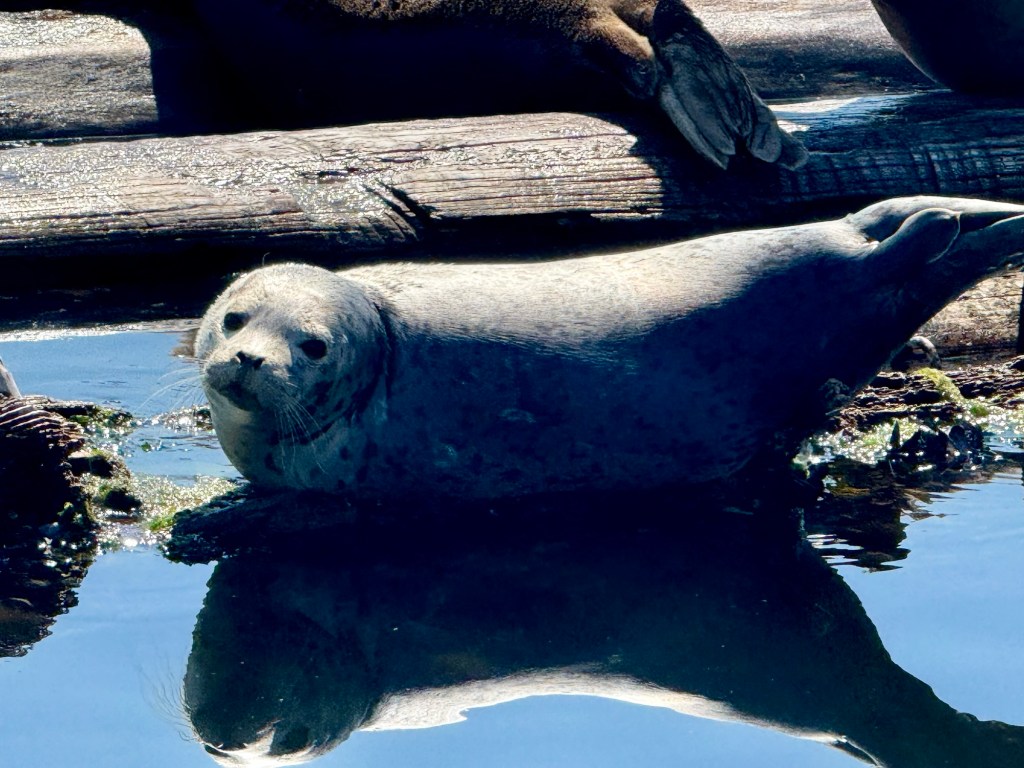 It’s hot. Our walk into town Sunday was sweltering. A few degrees cooler now. Took a nice paddle up toward Fish Park Monday morning. Lots of seals around.