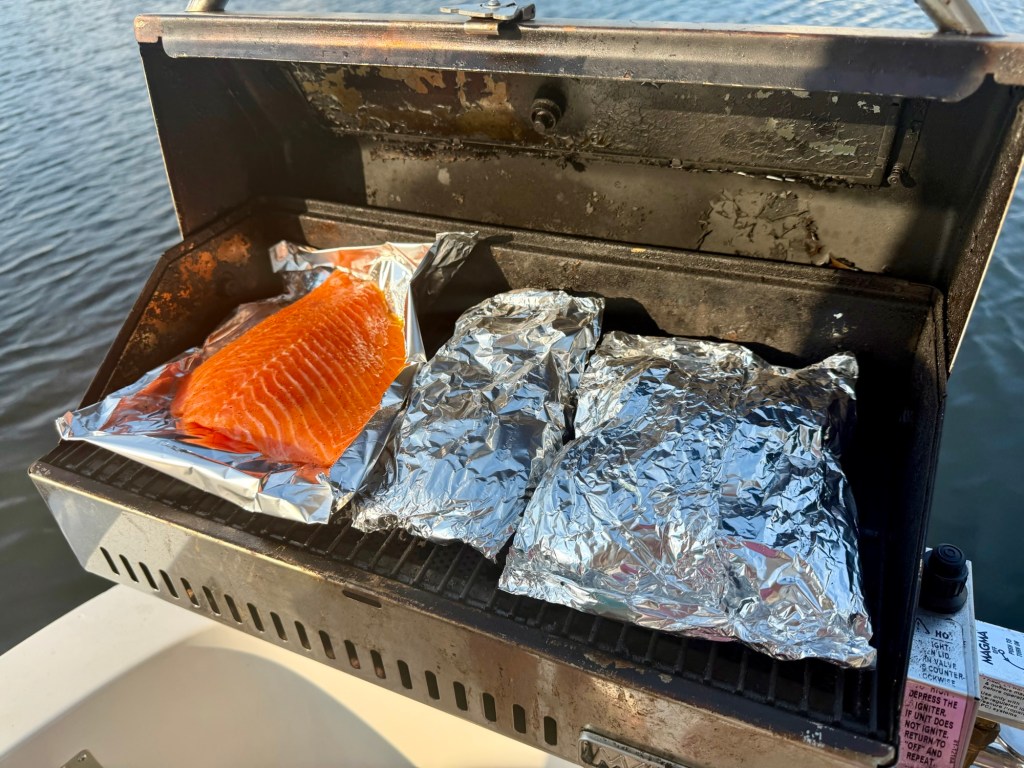 We’ve been perfecting our foil packet grilled meals lately. Monday night’s was a yummy chunk of salmon, one packet of potatoes with onion and garlic, and another with previously frozen broccoli. Broccoli got slightly mushy but overall, everything was delish! A fairly easy and healthy boat meal.