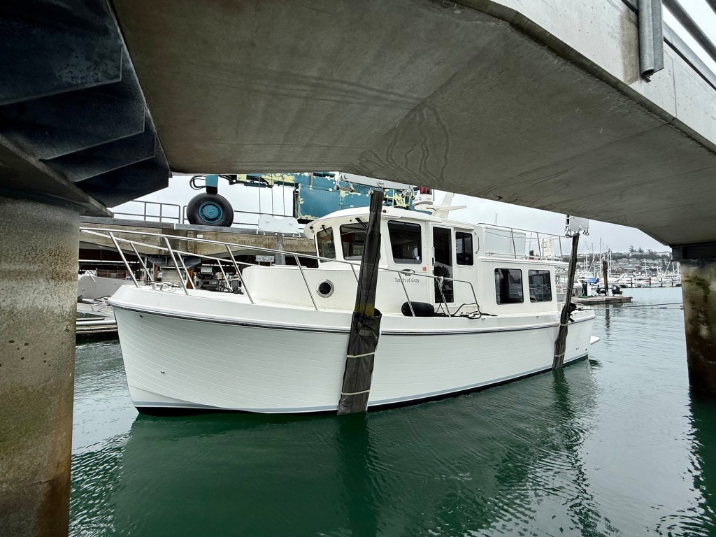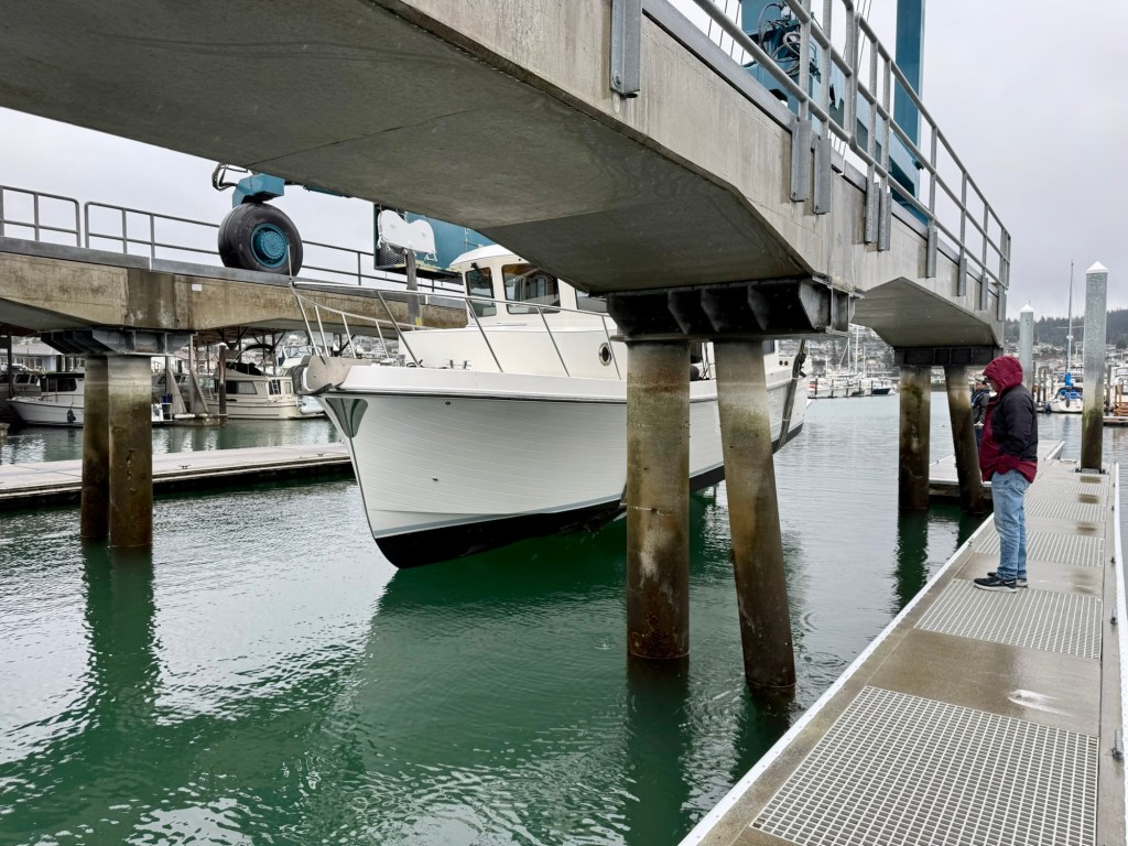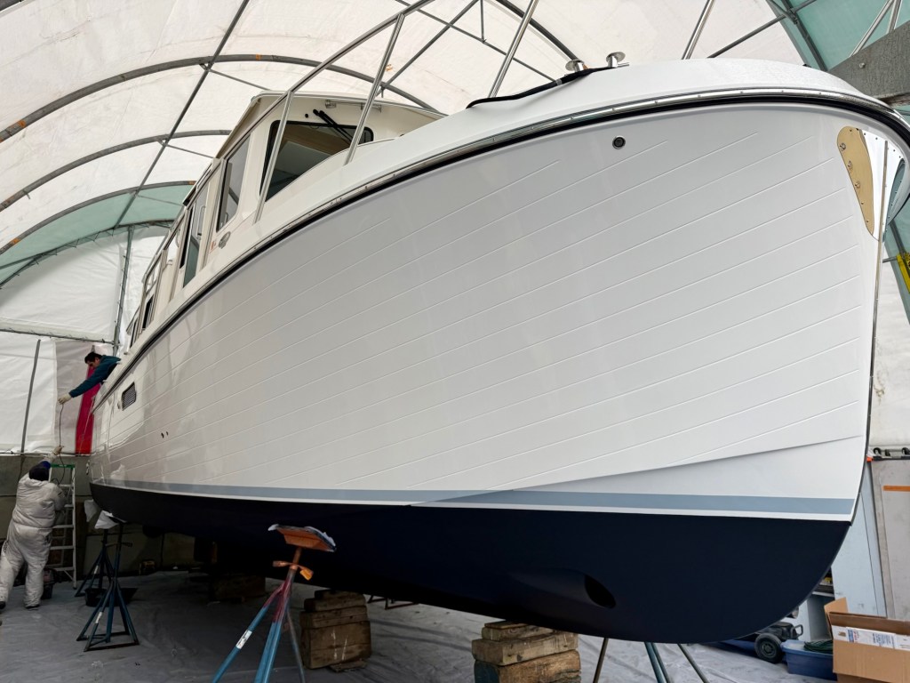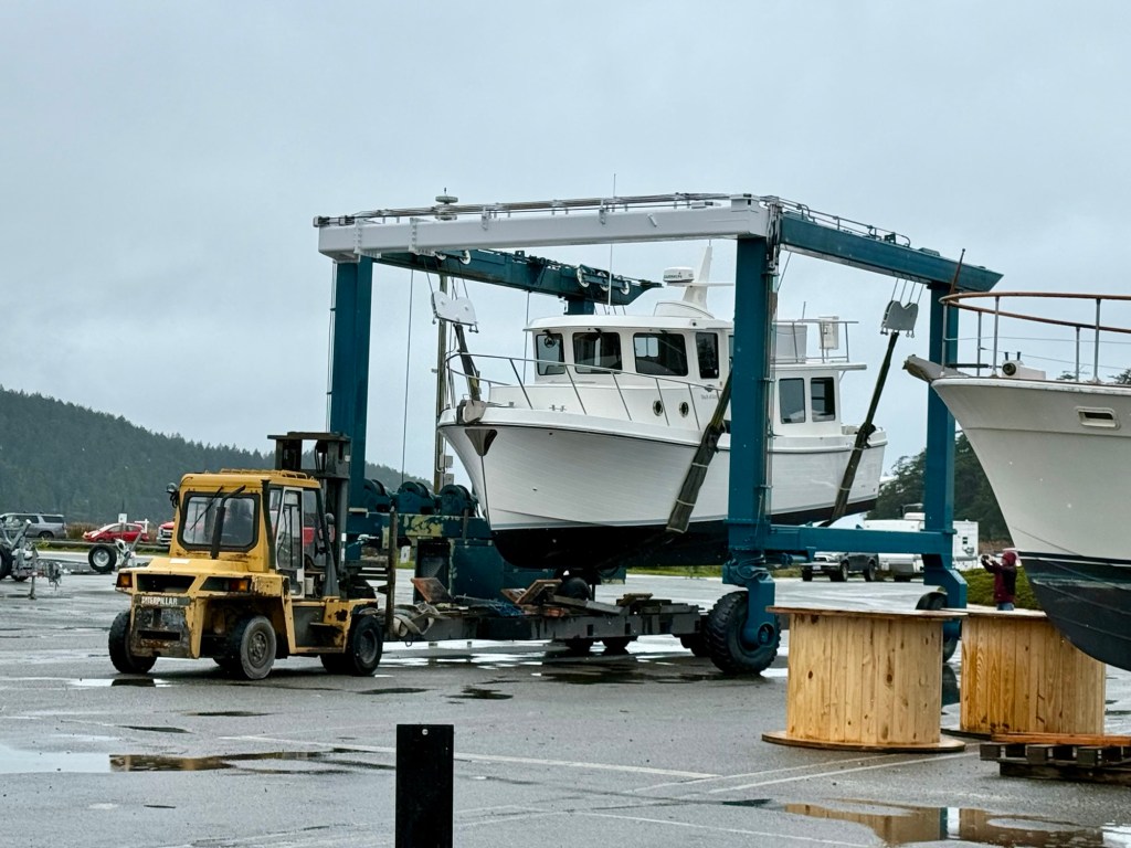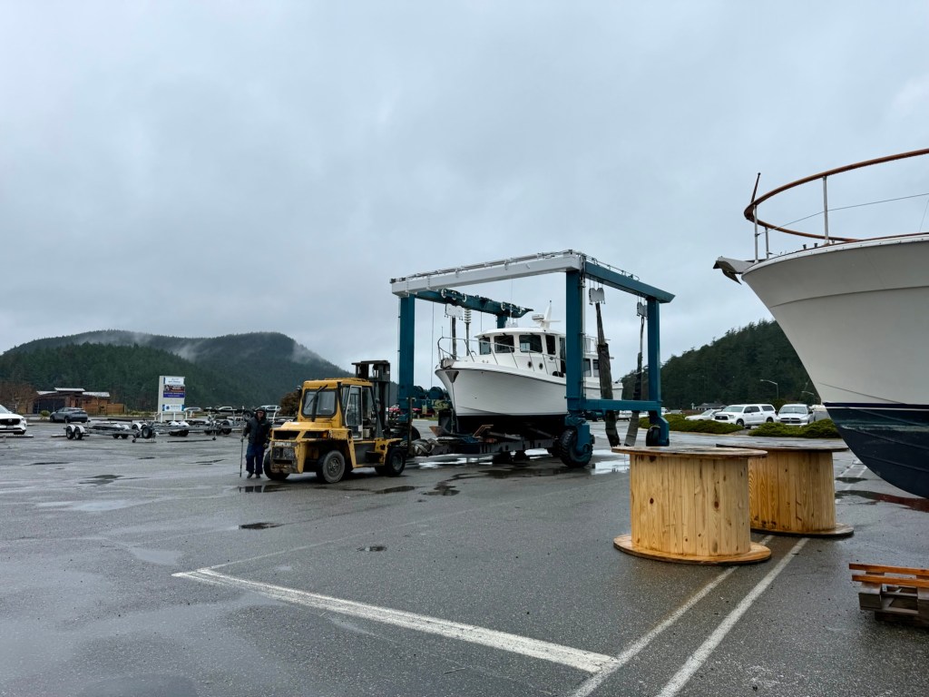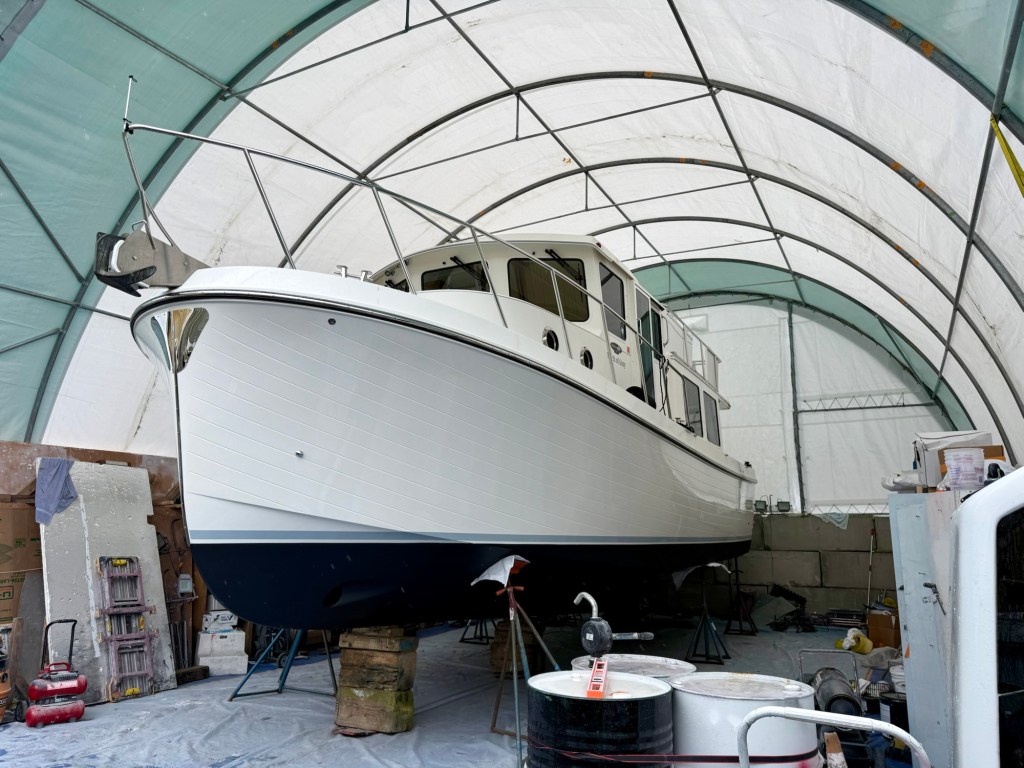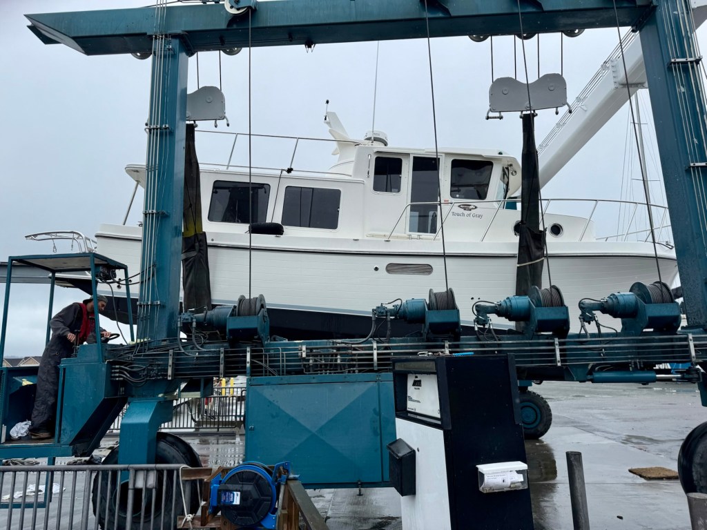 We arrived at Skyline Marine this morning to find ToG still in the tent. After taking a couple of pics of the shiny hull and new bottom paint we waited for the crew to load the boat onto a trailer and haul it to the lift.