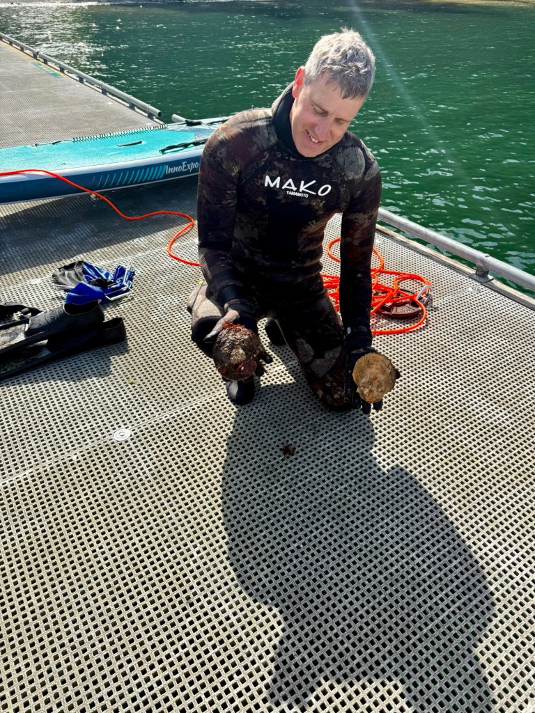My curiosity got the better of me and when he came in, I asked what he was after. Yep, scallops. He only got two, and said there are enormous leaves of seaweed laying over the seabed which are like trying to move sheets of plywood.