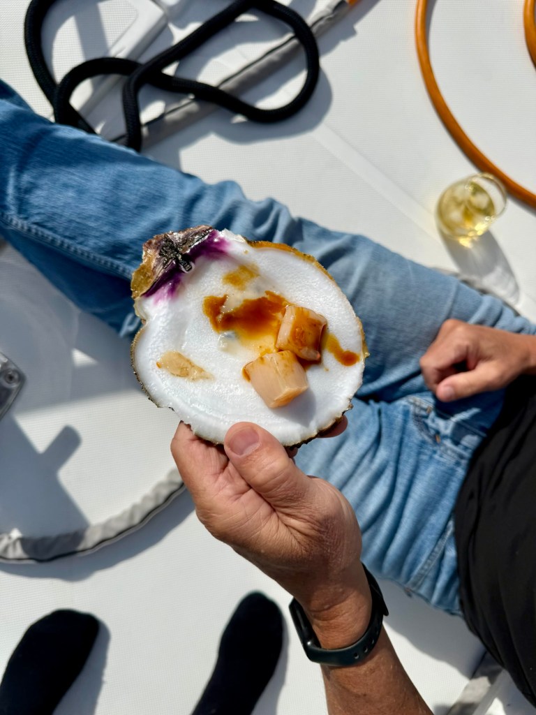 A little later we were on the bow enjoying drinks and the sunshine and they approached with a beautiful shell holding a couple of morsels of raw scallop in some sweet soy sauce. Yummy!